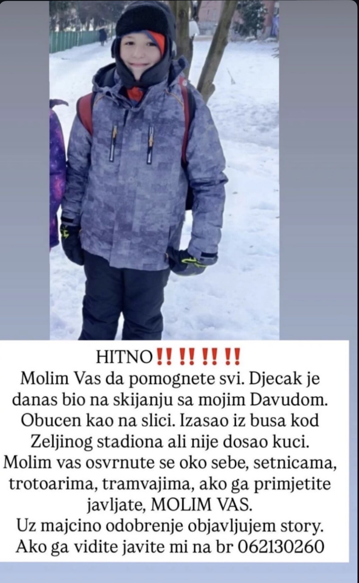 Prema saznanjima, dječak je bio na skijanju sa svojim prijateljem Davudom. Nakon povratka, izašao je iz autobusa kod stadiona Grbavica i od tada mu se gubi trag. Njegova porodica opisuje kako je dječak bio obučен toplo, u skladu sa zimskim uvjetima. Imao je sivu jaknu s kapuljačom, tamne pantalone, rukavice, ruksak, kapu i zaštitu za vrat. Ova detaljna informacija može pomoći svima koji su bili u blizini tog područja da brzo prepoznaju dječaka. Takođe, važnost ovih dodatnih informacija ne može biti precijenjena jer može pomoći u sužavanju pretrage i olakšanju pronalaska.