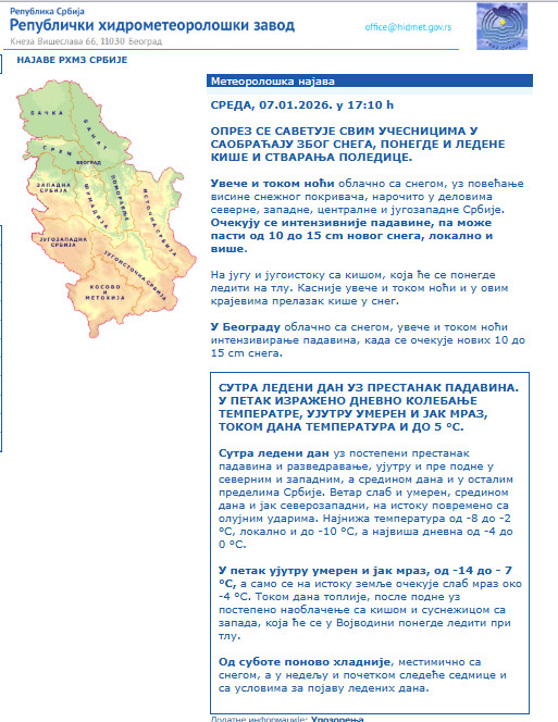 Prema dostupnim informacijama, oblačno vreme sa snegom očekuje se tokom večernjih sati i noći, posebno u severnim, zapadnim i centralnim delovima Srbije. Visina snežnog pokrivača može se povećati za dodatnih 10 do 15 cm, a lokalno i više, što dodatno povećava rizik od poledice. Na jugu i jugoistoku zemlje, kiša koja će padati može se lediti na tlu, stvarajući dodatne probleme za vozače i pješake. Ovakvi vremenski uslovi mogu dodatno otežati radove na održavanju puteva, a vozači bi trebali biti posebno oprezni prilikom vožnje na ovim područjima.