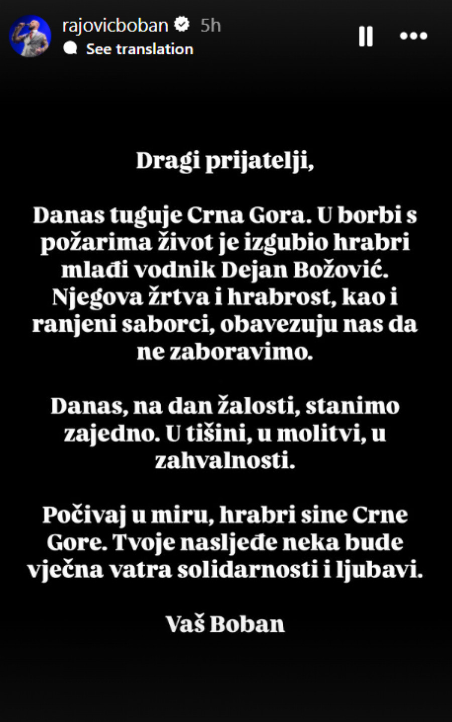 U jeku ove katastrofe, osjećaj zajedništva među ljudima postao je ključan za prevazilaženje teških trenutaka. Dok su mnogi izgubili sve, pojavila su se svjedočanstva hrabrosti i solidarnosti. Muzičar Boban Rajović, poznat po svojim emotivnim pjesmama, putem društvenih mreža podijelio je bol i tugu većine građana. Njegov post na Instagramu, u kojem je napisao: “Danas tuguje Crna Gora”, postao je simbol zajedništva koje je u tom trenutku obuhvatilo cijelu naciju. Rajovićeva poruka nije samo doprinijela jačanju osjećaja zajedništva, već je i potaknula mnoge da se aktivno uključe u pomoć onima koji su pretrpjeli gubitke tokom požara.