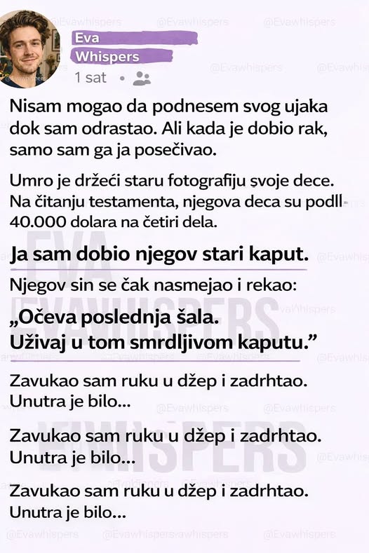 Zavukao sam ruku u džep i zadrhtao. Unutra je bilo… Prvo nisam mogao da verujem. Ispod tog starih tkanina, pronašao sam papir. Taj papir je nosio poruku – poruku koju mi je ujak ostavio pre nego što je otišao. Sadržavala je poruku ljubavi, zahvalnosti i ironije prema svemu što je imao. Ništa vredno u materialnom smislu, ali nešto neprocenjivo u duhovnom. U toj poruci sam saznao nešto što nisam znao o njemu. Pronašao sam u njemu njegovu poslednju želju, njegovu lekciju.