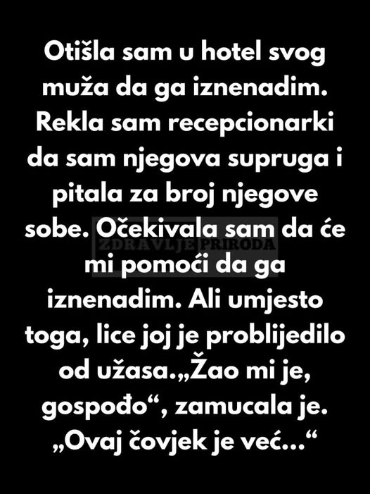 Ona je dugo razmišljala kako da obraduje svog supruga. Znala je da često boravi u hotelu zbog posla i pomislila je da bi bilo lijepo pojaviti se nenajavljeno i prirediti mu malo iznenađenje. U njenoj glavi to je bila romantična ideja – mali gest ljubavi koji bi pokazao koliko joj je stalo do njega.