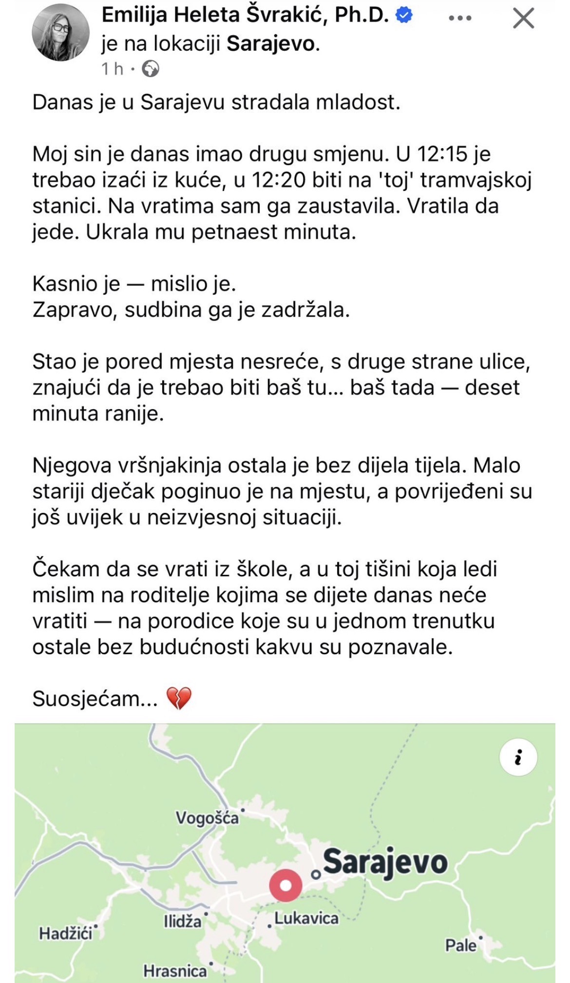 Jedna od najdirljivijih priča koja se pojavila nakon nesreće dolazi od Emilije Helete Švrakić, majke čiji je sin umalo postao žrtvom ovog strašnog incidenta. Emilija je na društvenim mrežama podijelila svoje emocije i misli, ukazujući na složenost emocija koje proživljava kao roditelj. Ova objava dirnula je mnoge, jer je u sebi nosila ne samo bol, već i zahvalnost što je njen sin izbjegao tragediju. Njene riječi su zrcalile strah, ali i olakšanje koje osjeća kada pomisli koliko je blizu bio tragediji koja je zadesila druge.