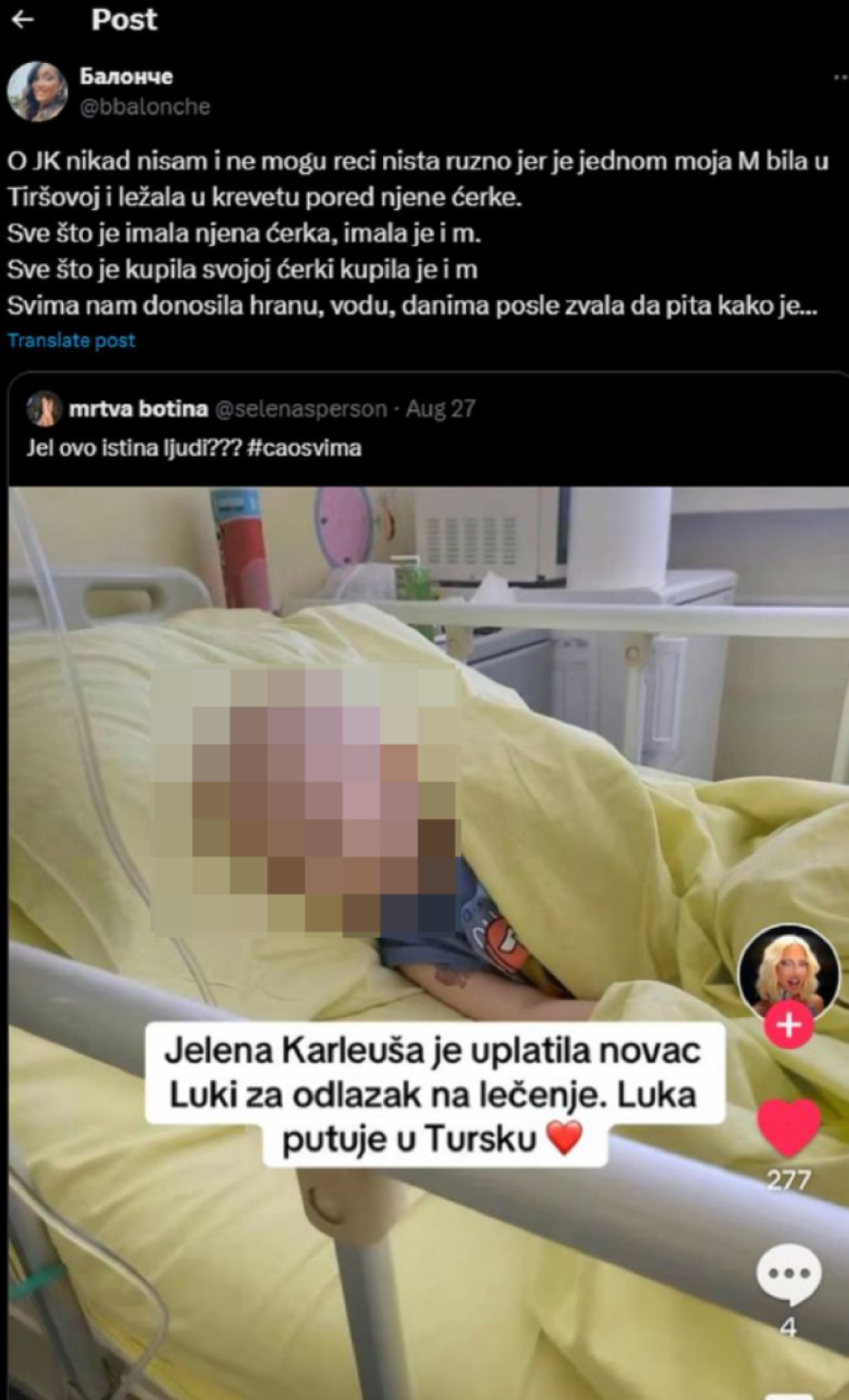 Prema dostupnim informacijama, dječak kojem je pomoć bila potrebna suočavao se s teškom bolešću koja zahtijeva liječenje u inostranstvu. Njegova porodica, iscrpljena od borbe sa zdravstvenim sistemom i problemima koji su se nagomilali, bila je na rubu očaja. U tom trenutku, umjetnica je odlučila da stane uz njih. Njena odluka da pokrije troškove liječenja, putovanja i svih dodatnih troškova bila je više od običnog financijskog doprinosa. To je bio izraz iskrene ljudske solidarnosti i empatije prema onima koji pate.